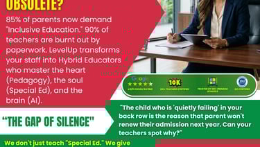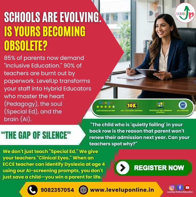 LevelUp Online Education equips schools with future-ready Hybrid Educators who master pedagogy, inclusive education, and AI-driven classroom intelligence.